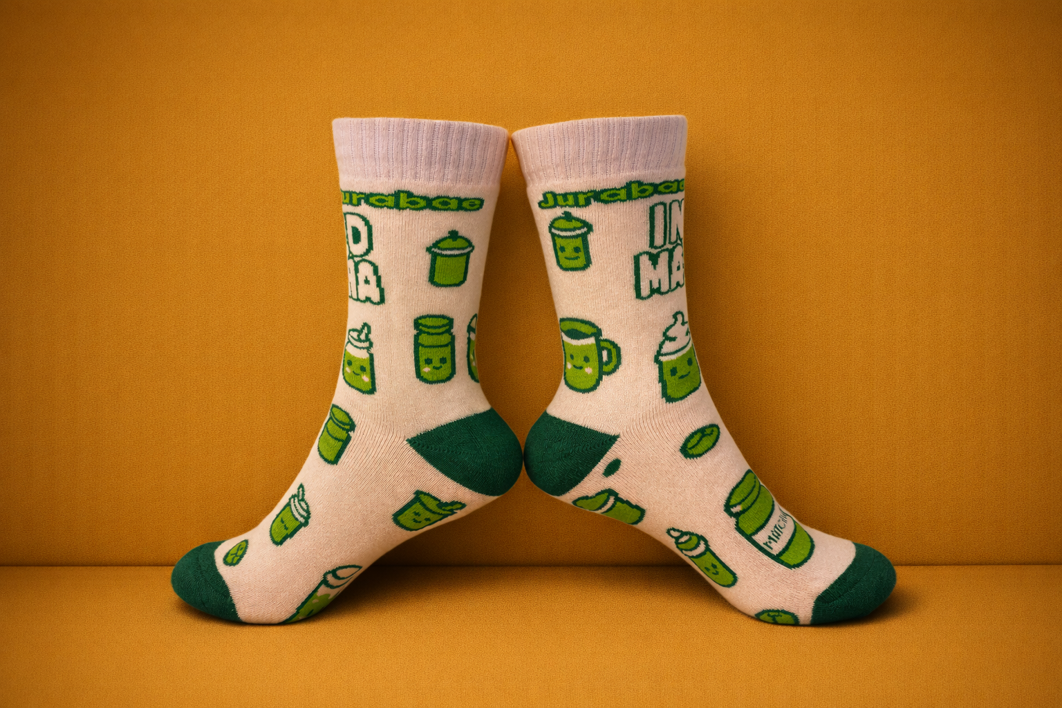 Inspired by the vibrant culture of Japanese matcha and street fashion, the Jurabae Matcha Energy Socks are designed for people who refuse to wear boring socks. The playful matcha artwork wraps around the sock creating a bold look that instantly upgrades your outfit.